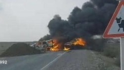 Кадамжайдагы жолдо өрттөнүп кеткен унаалар: Каза болгон адамдар бүгүн жерге берилет